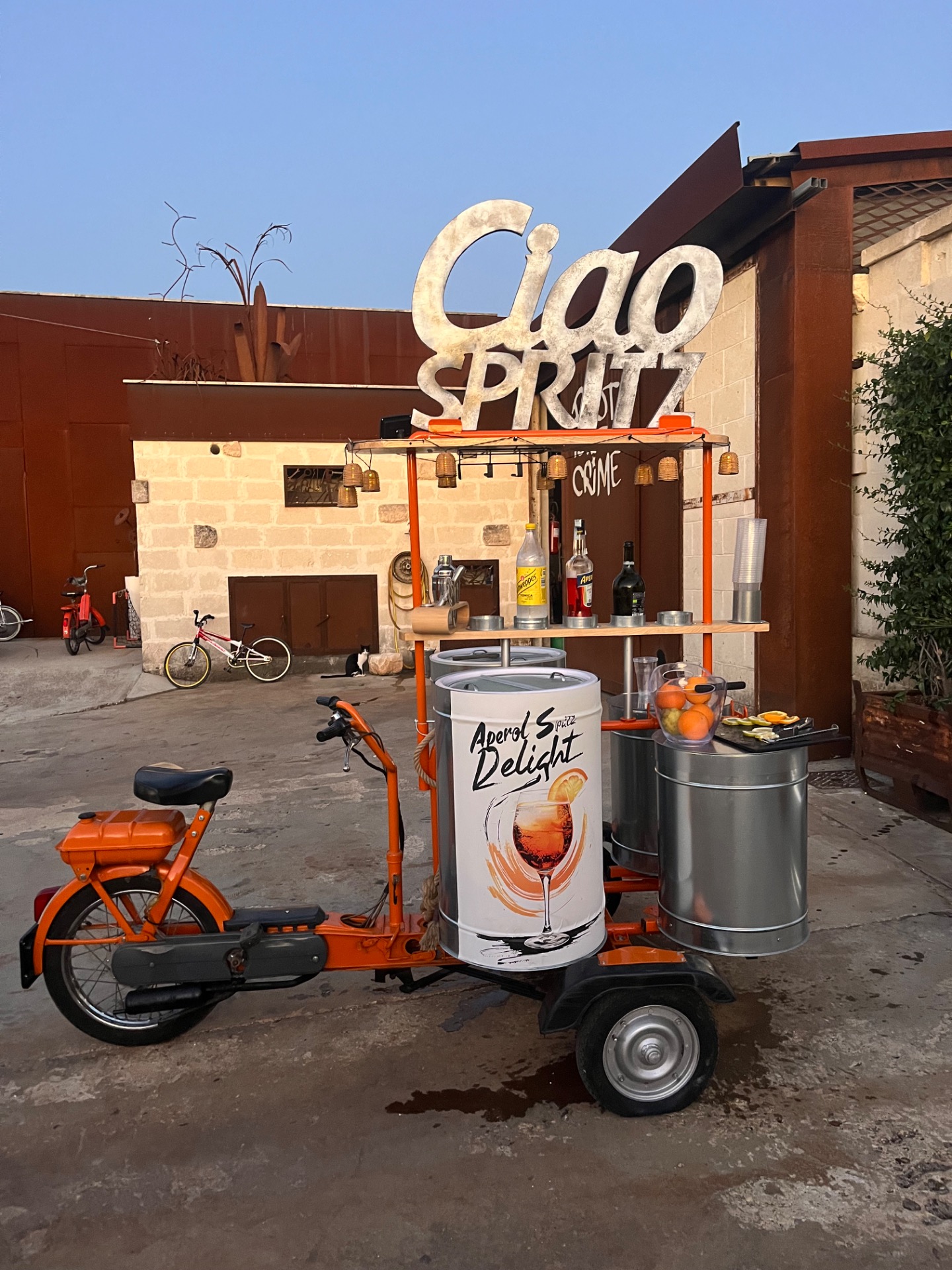 Il Ciao Spritz è il nostro Ciao Piaggio arancione, trasformato in un bar mobile elegante e funzionale. Dotato di frigo e ghiacciaia, è ideale per servire spritz, cocktail e aperitivi, creando un angolo scenografico e distintivo per ogni evento.